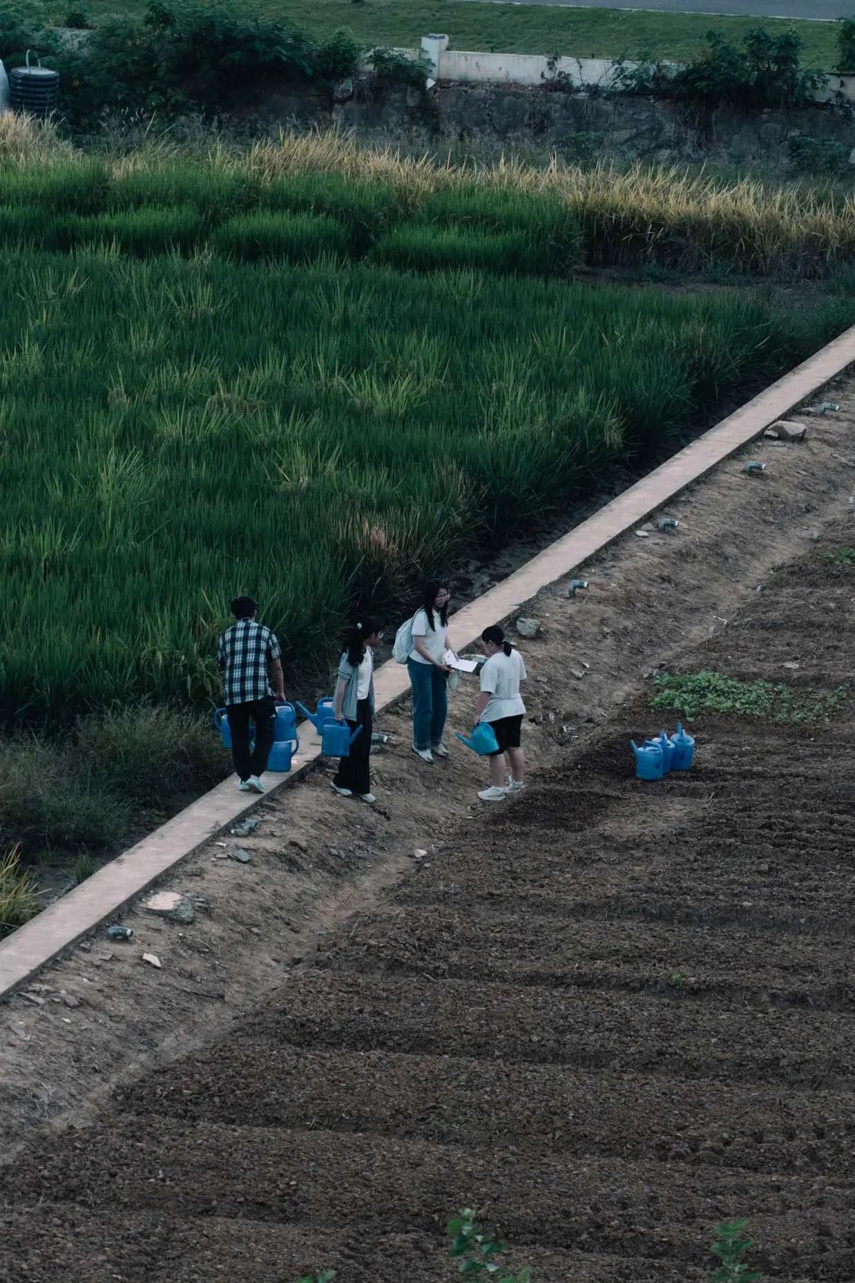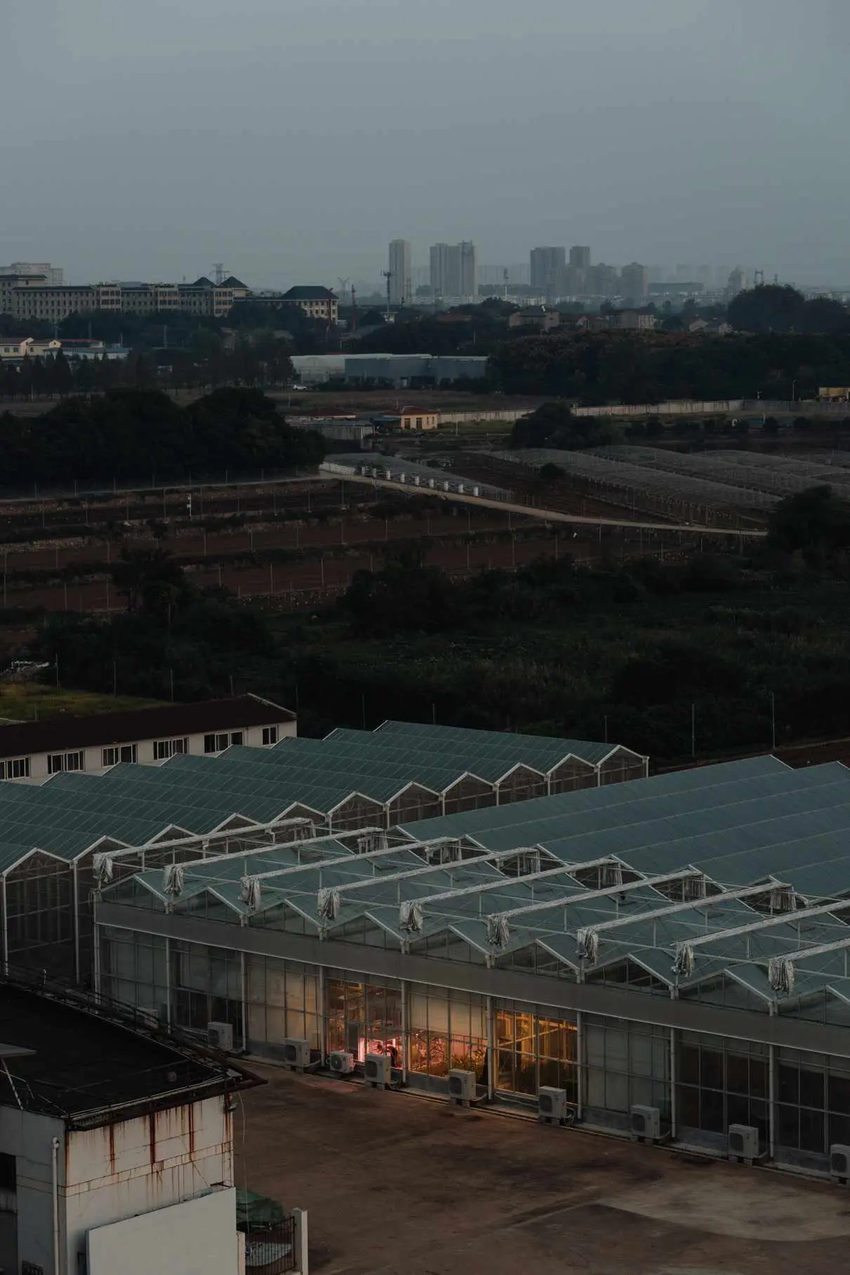 温室建筑群在前景远处是城市天际线笼罩在阴霾的天空下