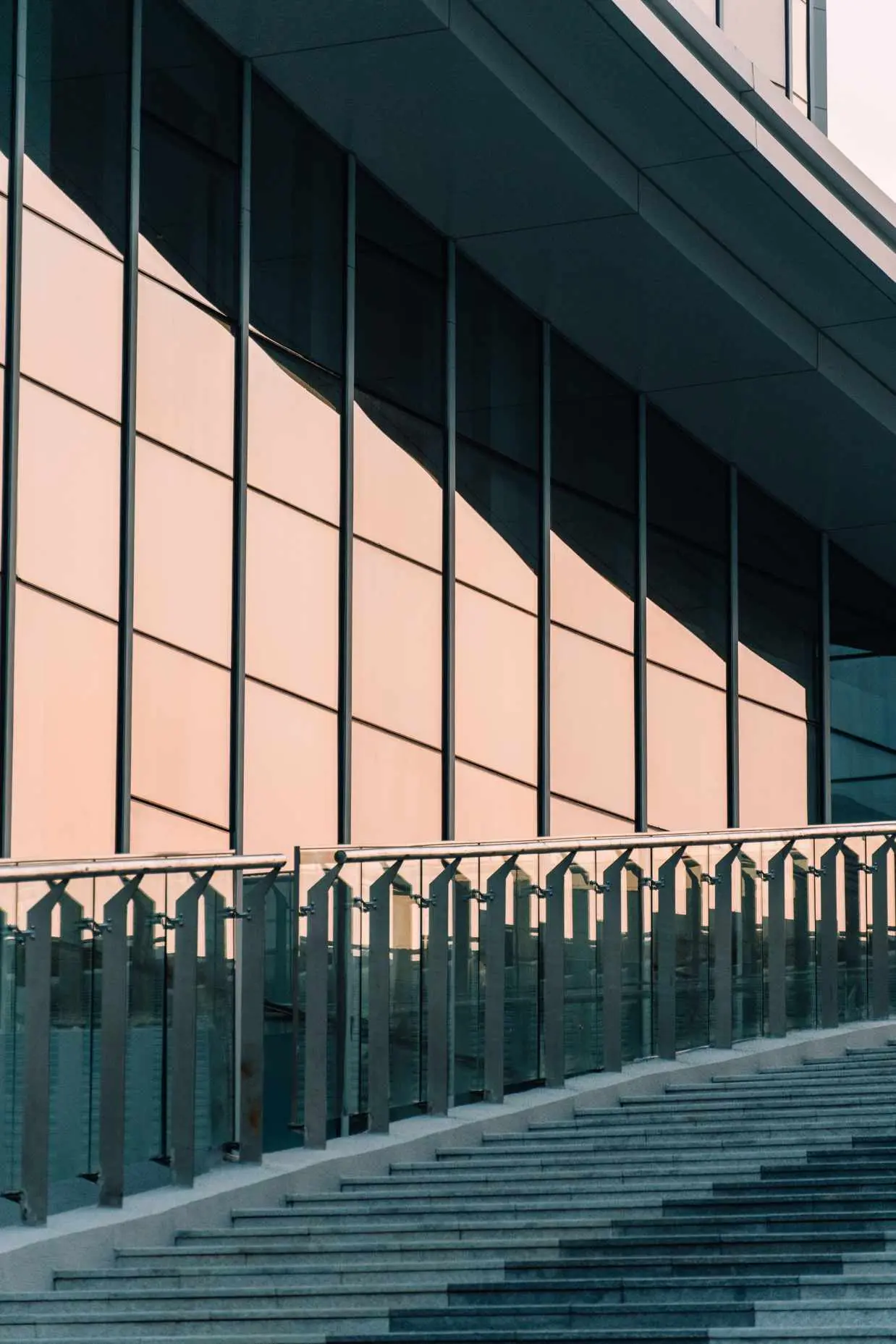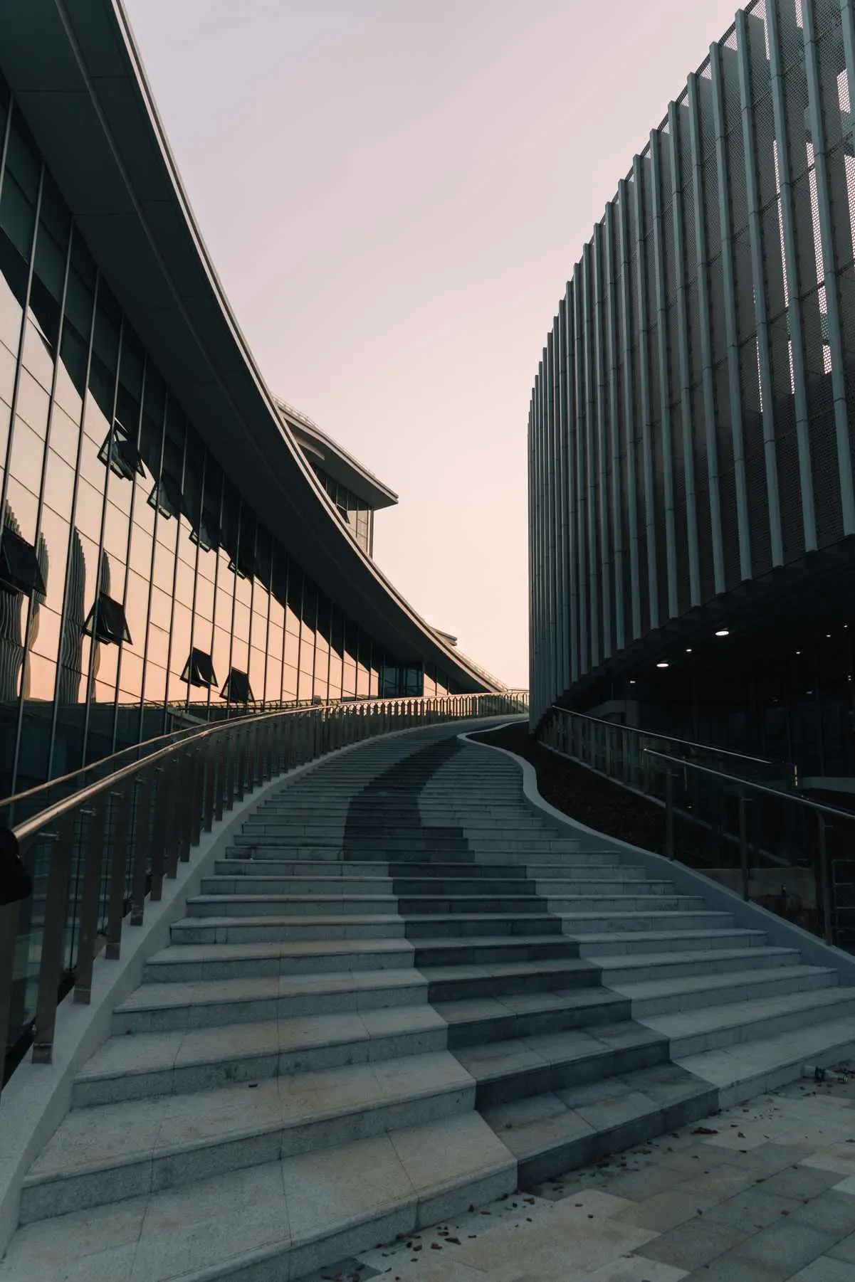阶梯连接两栋现代建筑 玻璃幕墙映衬天空