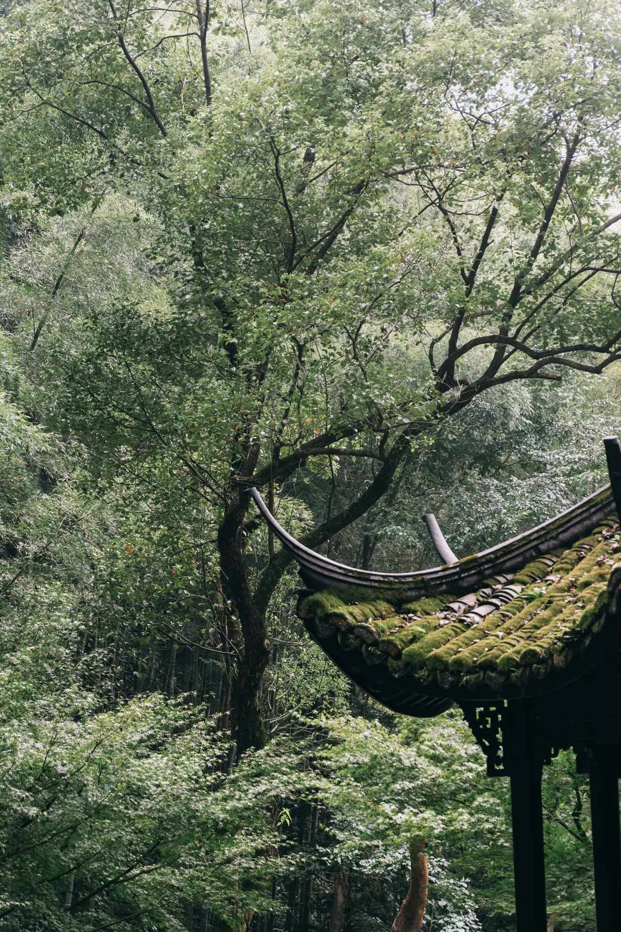 绿树掩映下的古建筑屋檐青苔点缀古朴自然